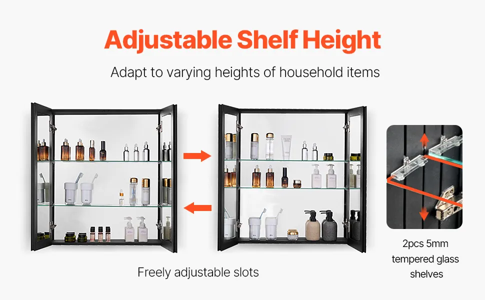 Wysokość i wysokość półek w lustrzanej szafce na leki można łatwo regulować, zapewniając indywidualną przestrzeń do przechowywania przedmiotów o różnych rozmiarach – jest to idealne rozwiązanie do przechowywania dużych butelek, małych kosmetyków i wszystkiego, co pomiędzy.