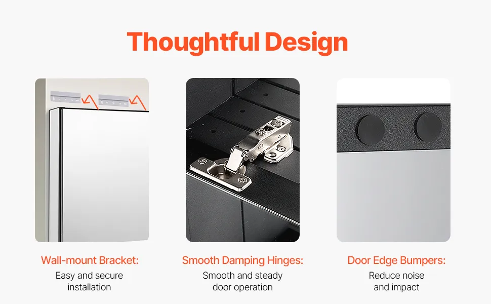 Dodatkowe funkcje premium: Wyposażona w wysokiej jakości, ciche zawiasy tłumiące drgania, ta szafka na leki z lustrem została zaprojektowana tak, aby otwieranie i zamykanie było płynne i ciche. Powierzchnia jest odporna na zarysowania i rdzę, a dołączone podkładki dodatkowo redukują hałas, co poprawia ogólne wrażenia użytkownika