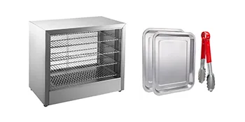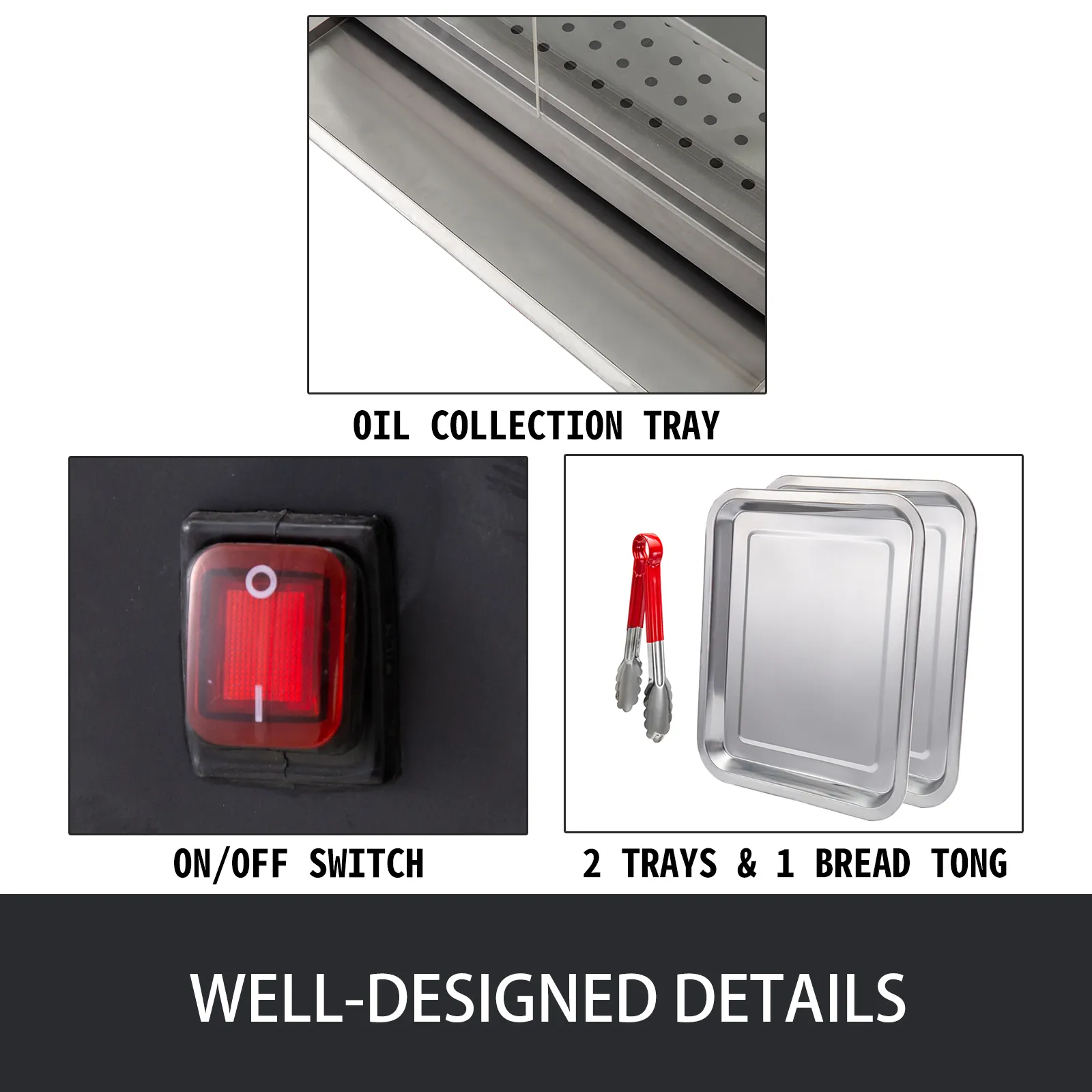 Dekoracyjne ciepłe światła sprawiają, że jedzenie jest bardziej atrakcyjne i lśniące; Podwójne rurki grzewcze do szybkiego nagrzewania; poniżej znajduje się miska do zbierania oleju; W zestawie 2 arkusze ze stali nierdzewnej i 1 szczypce do chleba.