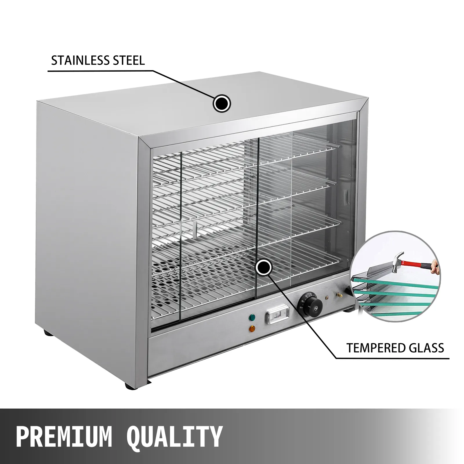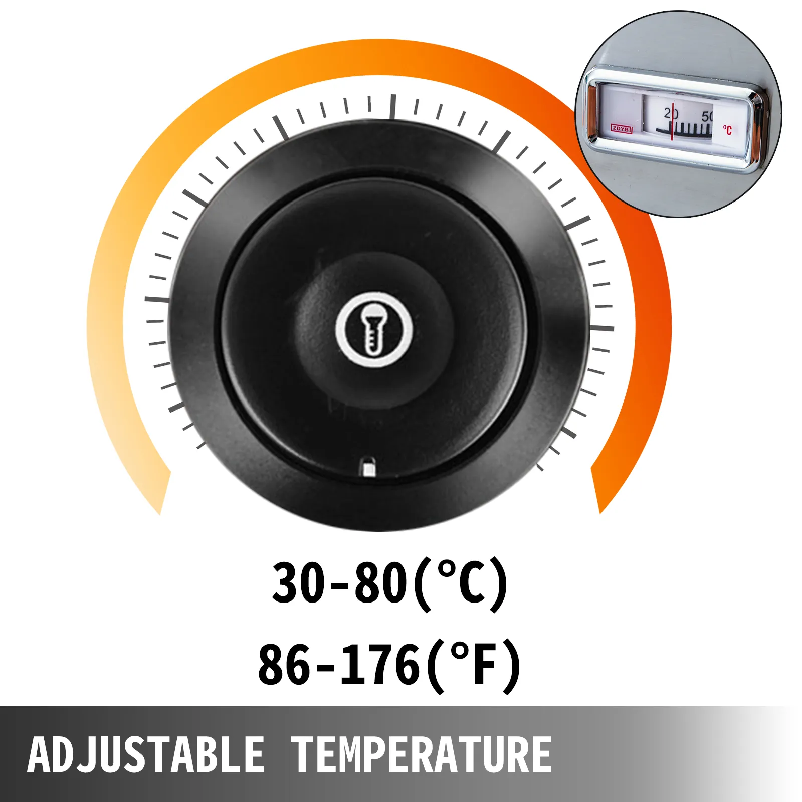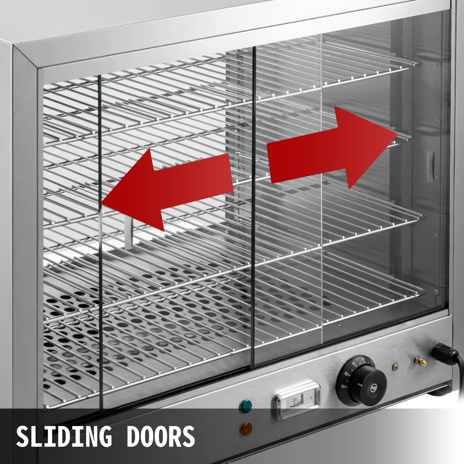 Ten podgrzewacz misy o mocy 800 W jest wykonany ze stali nierdzewnej 304 i szkła hartowanego, trwały i stabilny. Drzwi przesuwne ułatwiają dostęp do artykułów spożywczych. Dzięki regulowanej temperaturze 30-85 ℃ (86-185 ℃) nadaje się do różnych potraw, w tym pizzy, ciast, burgerów itp.