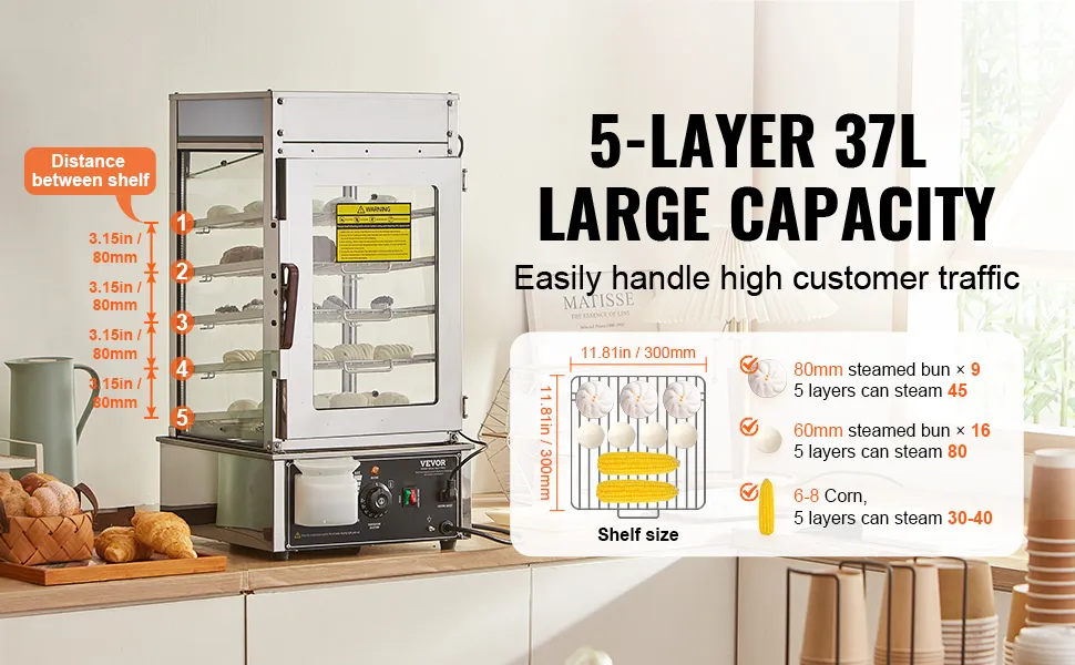 VEVOR Komercyjny podgrzewacz do żywności z wyświetlaczem, 5-poziomowy parowar i podgrzewacz bułek, regulacja temperatury od 30°C do 110°C, podgrzewacz do bułek na parze ze stali nierdzewnej z diodą LED, podgrzewanie parą bułek na parze Siomai Corn