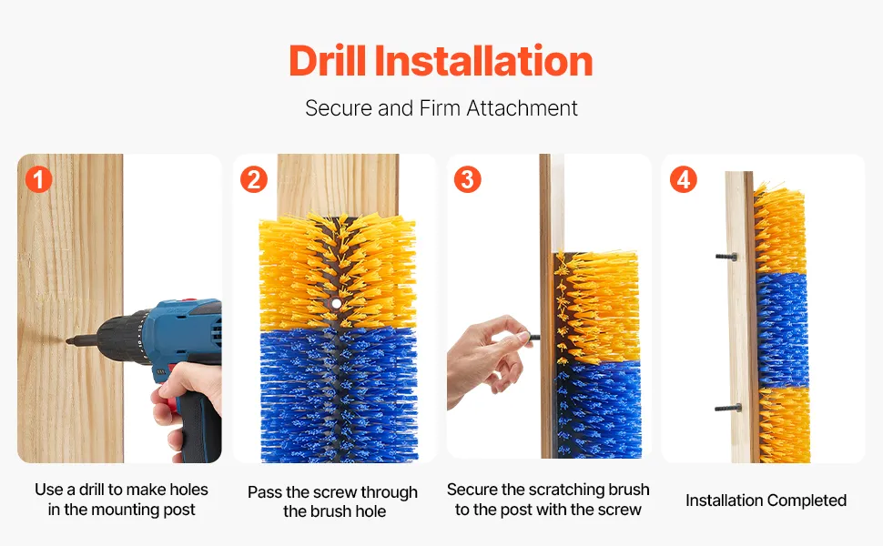 Łatwy montaż i bezpieczeństwo: Szczotka do drapania dla krów jest dostarczana z dwoma zestawami śrub montażowych, co ułatwia montaż w stajniach, zagrodach lub na wybiegach. Pozostaje stabilna, nawet gdy korzystają z niej duże zwierzęta.