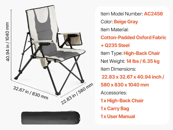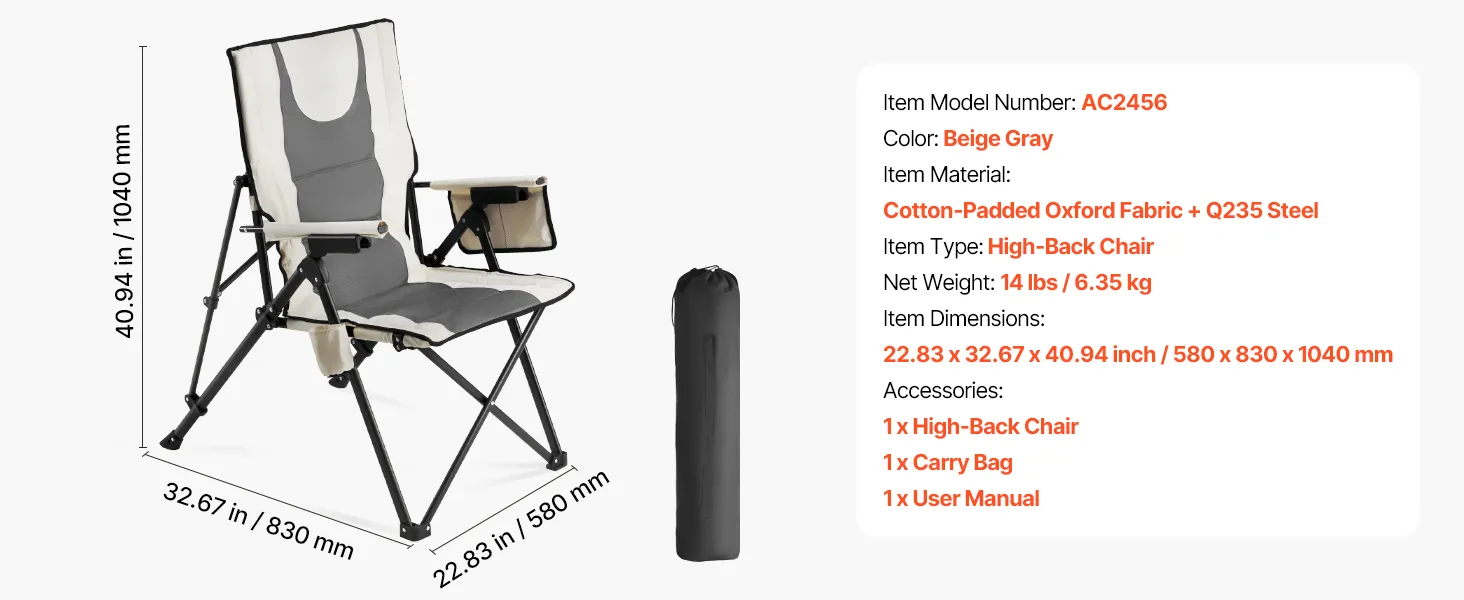 Konstrukcja z wysokim oparciem: To duże, składane krzesło kempingowe o wymiarach około 580 x 830 x 1400 mm oferuje dużo miejsca i ergonomiczne, wysokie oparcie, co gwarantuje długotrwały komfort siedzenia nawet podczas dłuższego użytkowania.