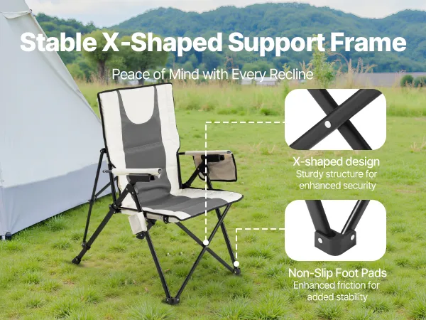 Konstrukcja ramy w kształcie litery X równomiernie rozkłada ciężar, zapewniając stabilność siedziska i oparcia oraz brak chybotania. Składane krzesło kempingowe ma antypoślizgowe nóżki, które zapewniają lepszą przyczepność do podłoża – podwójna stabilność i bezpieczne siedzenie i leżenie.