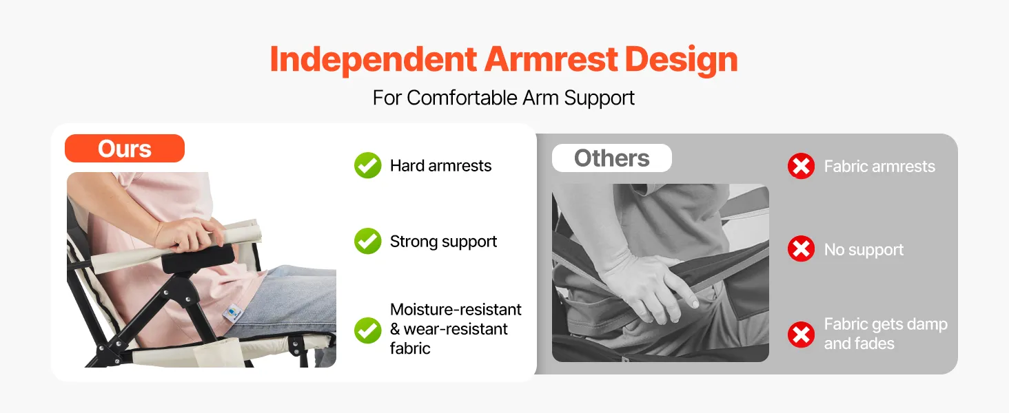 Regulowane pozycje odchylenia: Nasze krzesło ogrodowe oferuje trzy kąty odchylenia i podłokietniki, które można przesuwać do przodu i do tyłu, zapewniając indywidualny komfort siedzenia. Idealne do czytania, relaksu lub krótkiej drzemki – łagodzi zmęczenie ramion, szyi i rąk.