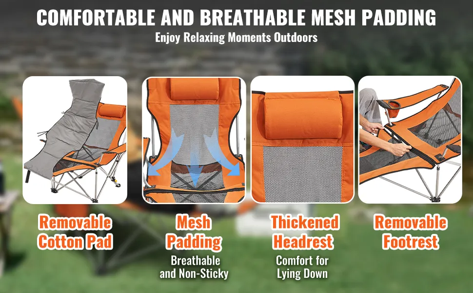 Komfort: Wytrzymała, siatkowa wyściółka naszego przenośnego fotela jest połączona z wyjmowaną poduszką, zapewniającą miękki komfort. Wyściełany zagłówek podpiera głowę i dopasowuje się do kształtu szyi, a podnóżek pozwala zrelaksować się w pozycji półleżącej. Podnóżek można również zdemontować w zależności od potrzeb.