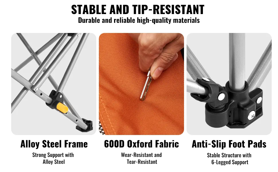 To solidne i zapewniające stabilność krzesło kempingowe wykonane jest z wysokowytrzymałej stali stopowej i tkaniny Oxford 600D. Antypoślizgowe podkładki pod stopy i sześcioramienna konstrukcja zapewniają stabilność podczas użytkowania na zewnątrz.
