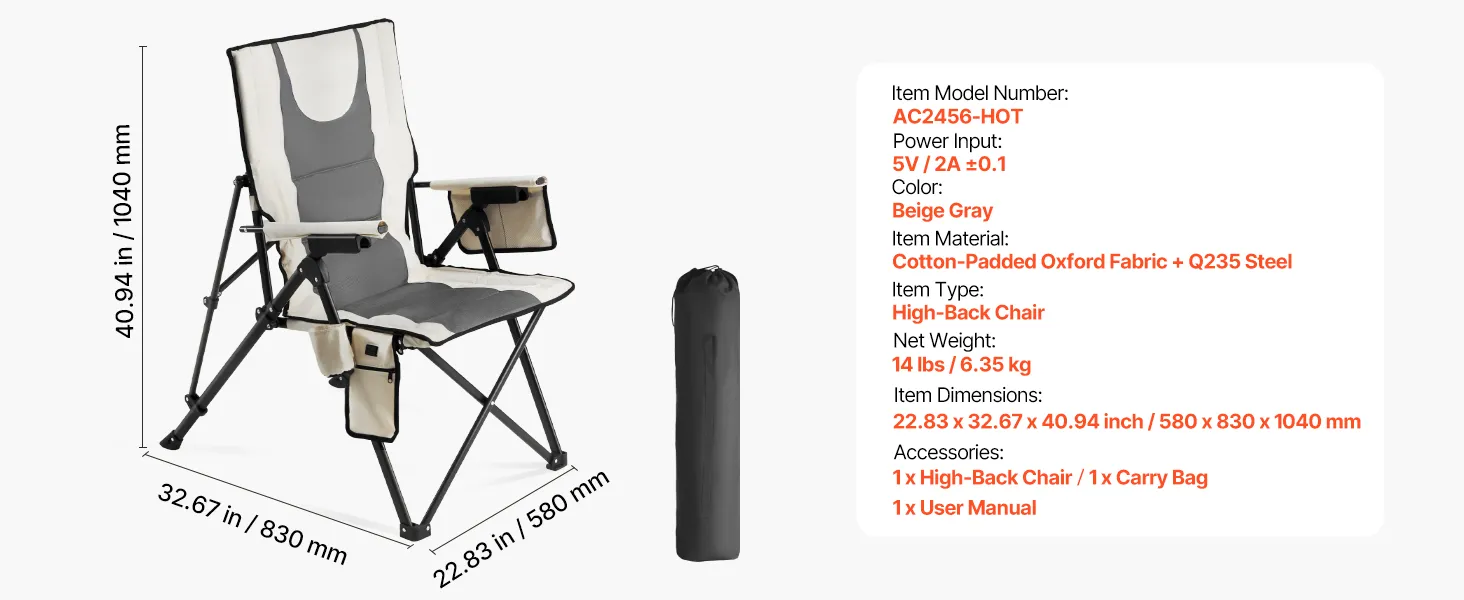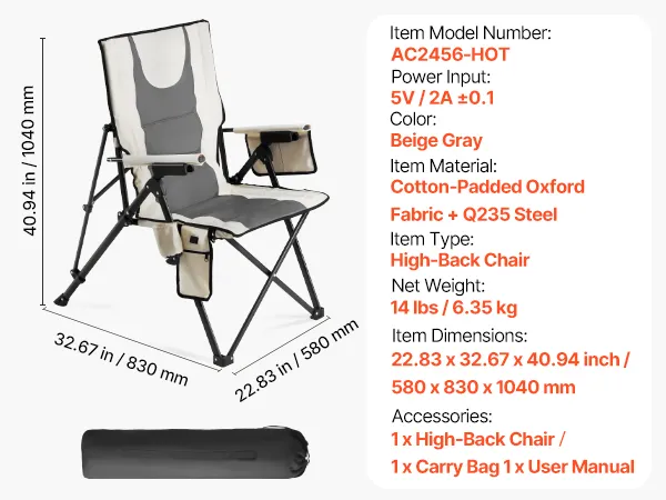 VEVOR Podgrzewane krzesło kempingowe, 3 ustawienia ogrzewania, składane krzesło z wysokim oparciem, nośność 117 kg, w pełni wyściełane krzesła plażowe z podłokietnikiem i uchwytem na kubek, krzesła ogrodowe do użytku na zewnątrz, 58 x 83 x 140 cm