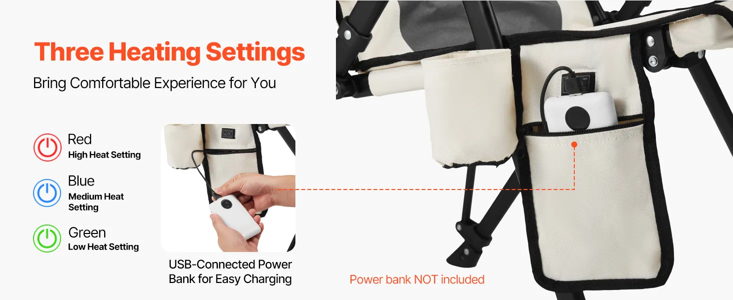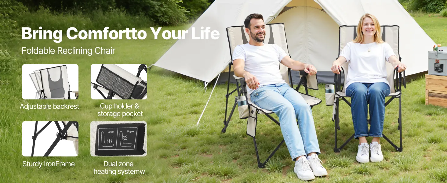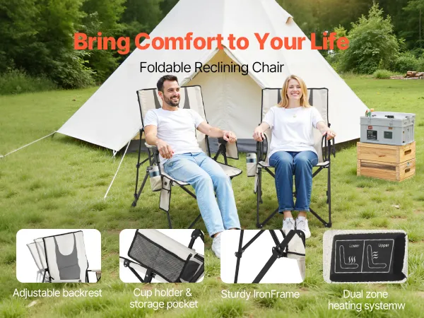 Dwustrefowe ogrzewanie: To podgrzewane krzesło kempingowe posiada dwie strefy grzewcze, zapewniające komfortowe, spersonalizowane ciepło. Dostosuj temperaturę oparcia i siedziska do swoich potrzeb – idealne na kemping w chłodne dni i chłodne noce.