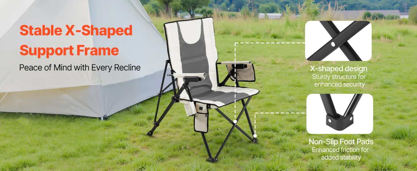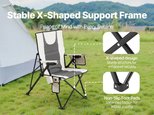 Konstrukcja ramy w kształcie litery X równomiernie rozkłada ciężar, zapewniając stabilne, stabilne siedzisko i oparcie. Podgrzewane, składane krzesło ma antypoślizgowe nóżki zapewniające lepszą przyczepność – podwójna stabilność i bezpieczne siedzenie i leżenie.