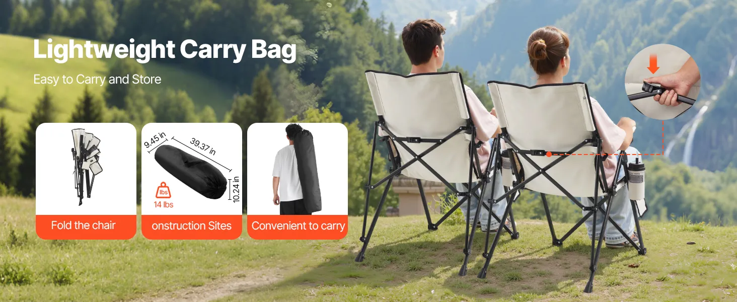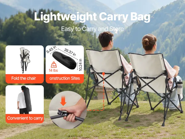 Każde krzesło kempingowe z wysokim oparciem jest dostarczane z lekką torbą transportową z uchwytem. Po złożeniu wygodnie mieści się w torbie i można je przenosić jedną ręką – komfort, który sprawdzi się wszędzie.