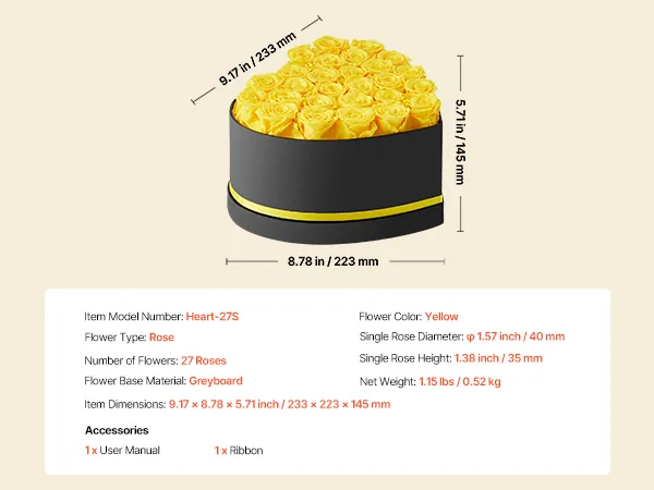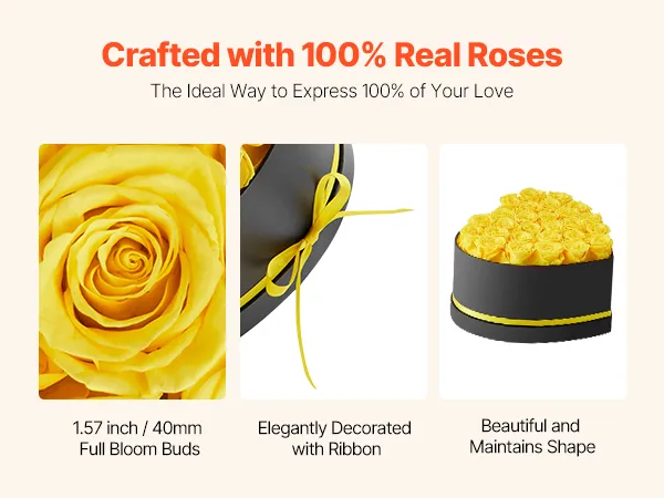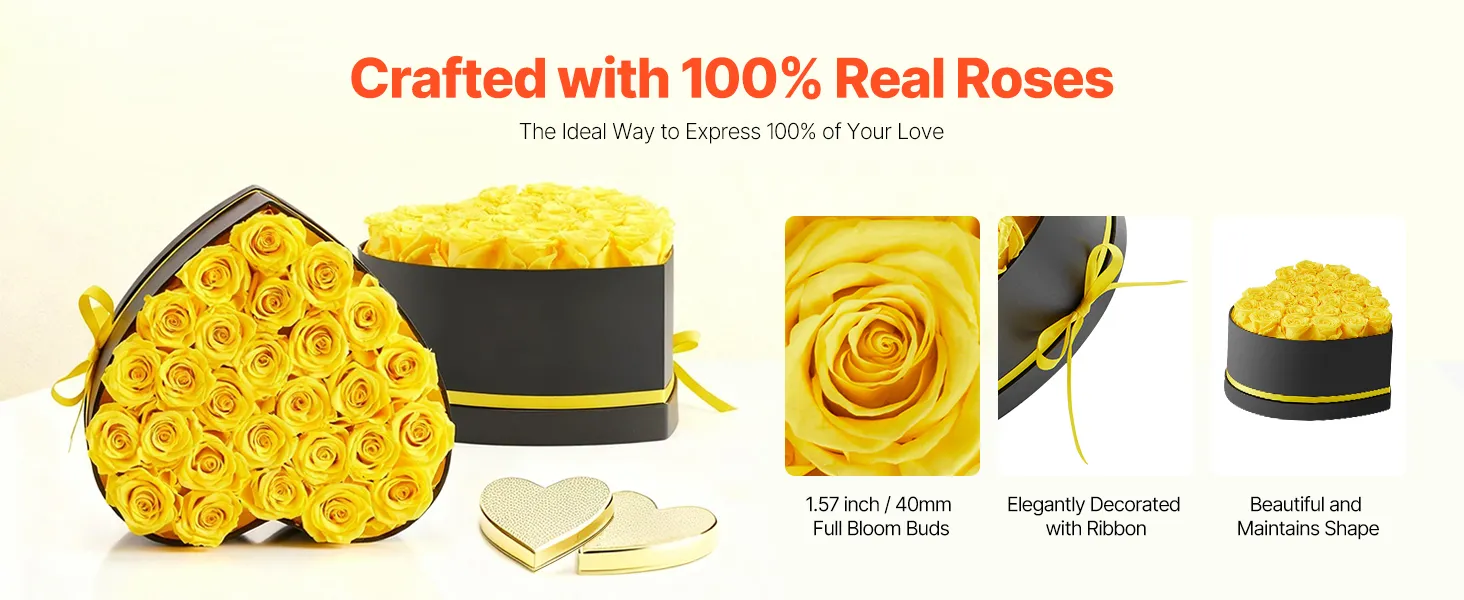 VEVOR 27 szt. Wiecznych róż w pudełku w kształcie serca, bukiet konserwowy, pudełko na kwiaty dla żony, matki, kochanki, na ślub, Dzień Matki, Walentynki, Boże Narodzenie, kolor żółty