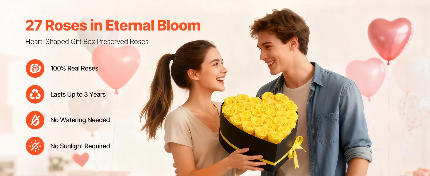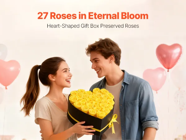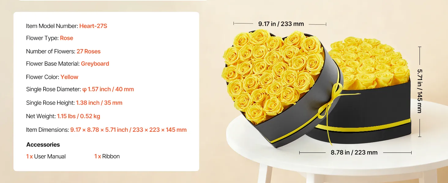 Wieczne róże: Każda wieczna róża wykonana jest z 27 prawdziwych, zakonserwowanych róż. Została starannie zapakowana w pudełko w kształcie serca, co zapewnia jej żywą, elegancką i romantyczną oprawę.