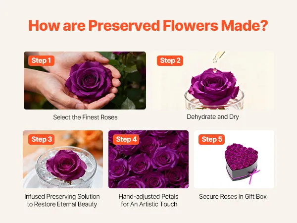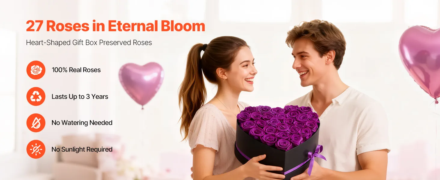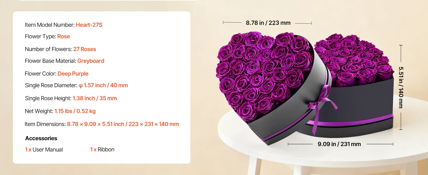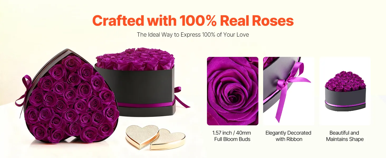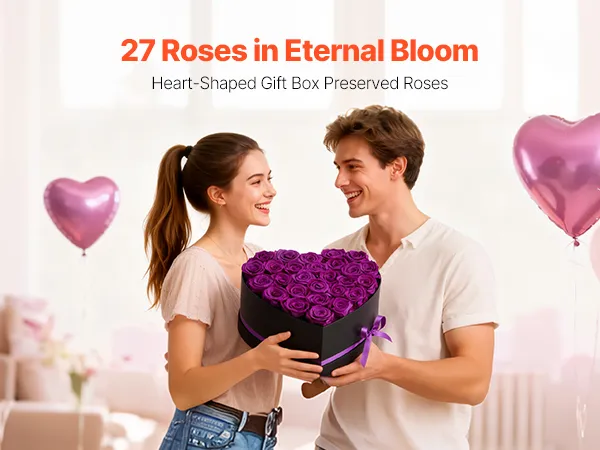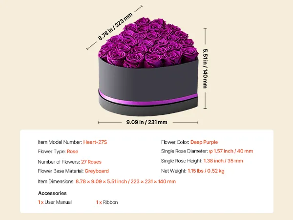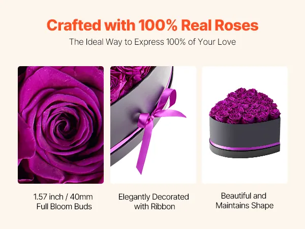 Wieczne róże: Każda wieczna róża wykonana jest z 27 prawdziwych, zakonserwowanych róż. Została starannie zapakowana w pudełko w kształcie serca, co zapewnia jej żywą, elegancką i romantyczną oprawę.
