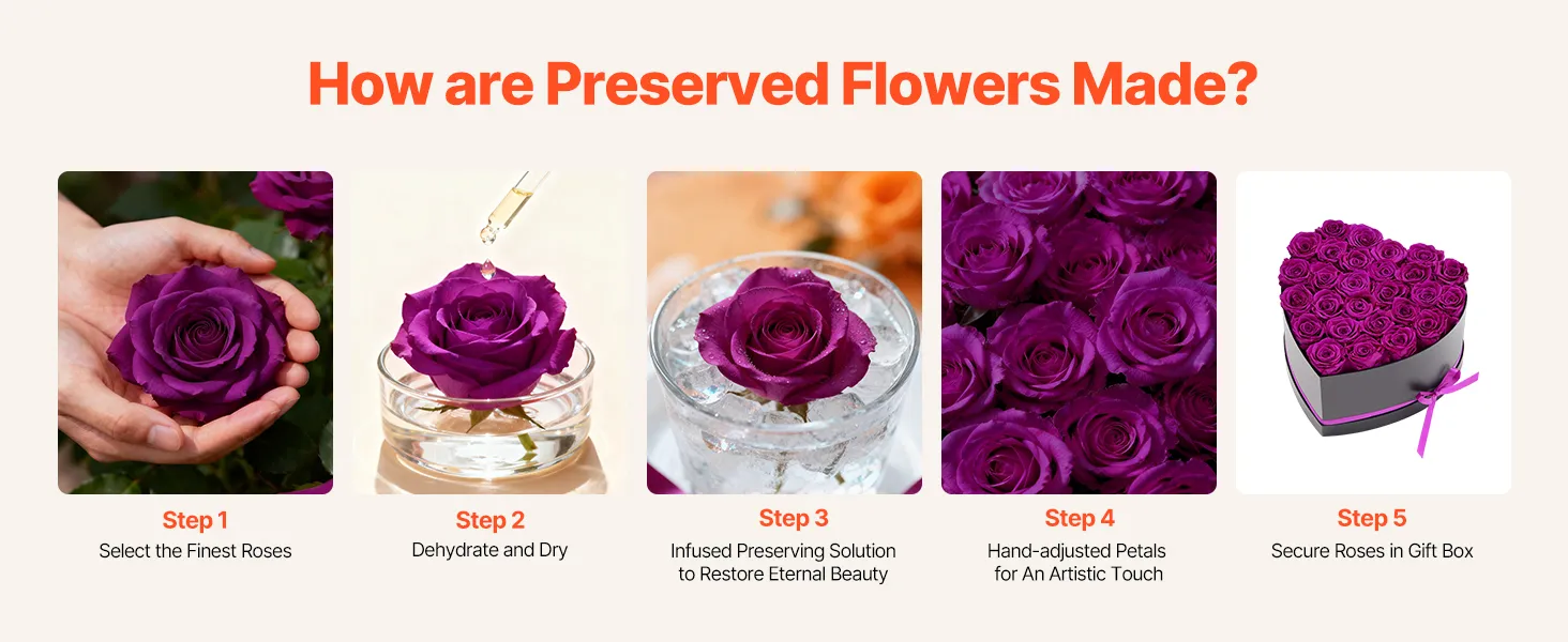 Te wieczne róże są wykonane w 100% z prawdziwych róż w pełnym rozkwicie i żywych kolorach. Nie wymagają wody ani światła słonecznego i sprawią, że każda uroczystość stanie się niezapomnianym, romantycznym wspomnieniem.