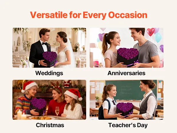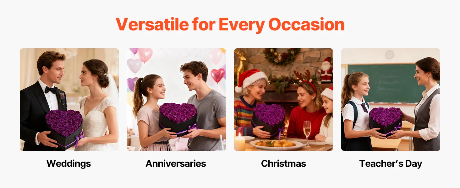 Romantyczne wieczne róże w eleganckim pudełku ze wstążką są idealnym prezentem, by wyrazić miłość partnerowi, mamie lub dziewczynie z okazji Bożego Narodzenia, urodzin lub innych specjalnych okazji.