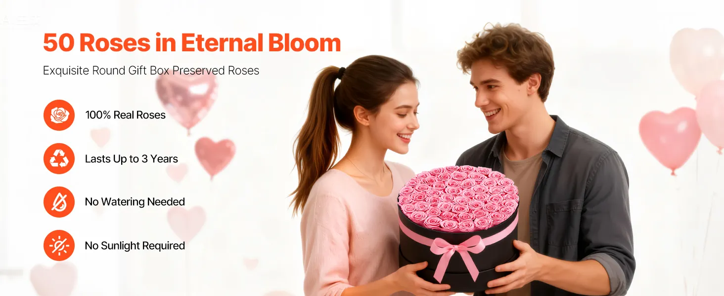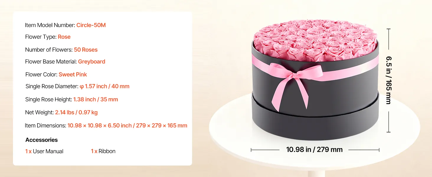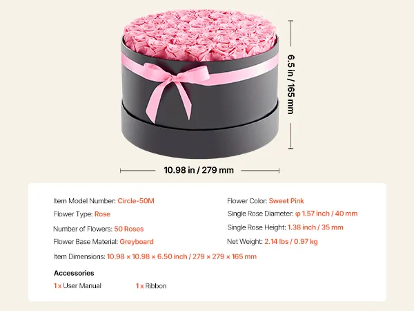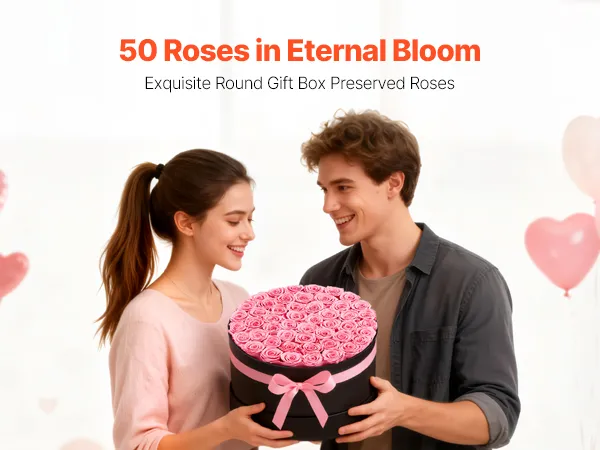 Wieczne róże: Każda wieczna róża wykonana jest z 50 prawdziwych, zakonserwowanych róż. Została starannie umieszczona w okrągłym pudełku, co zapewnia żywą, elegancką i romantyczną prezentację.