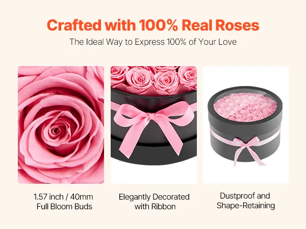 Te wieczne róże są wykonane w 100% z prawdziwych róż w pełnym rozkwicie i żywych kolorach. Nie wymagają wody ani światła słonecznego i sprawią, że każda uroczystość stanie się niezapomnianym, romantycznym wspomnieniem.