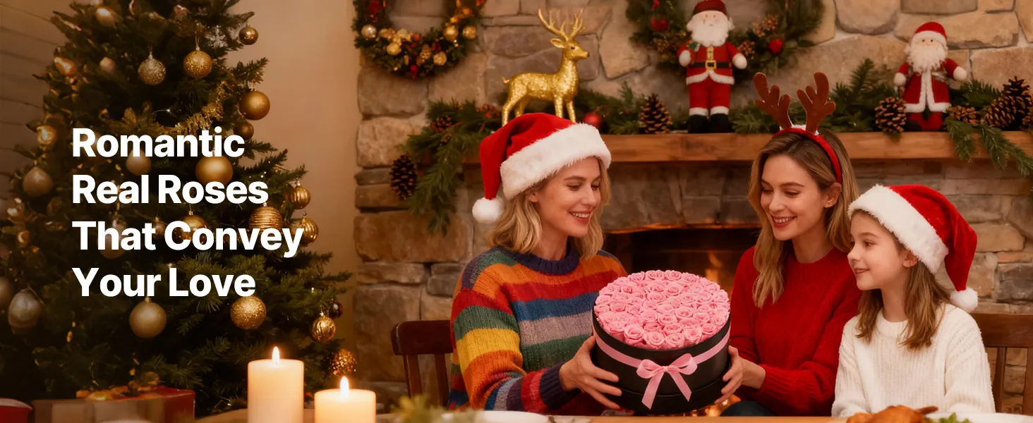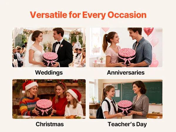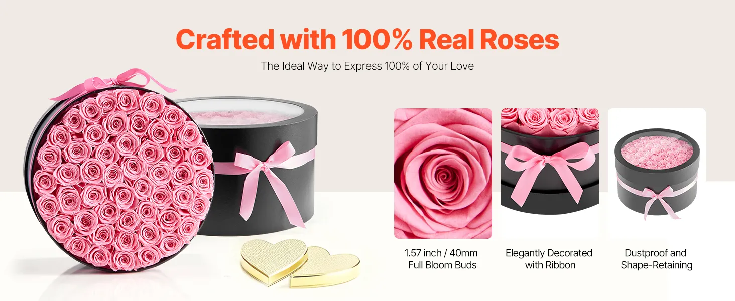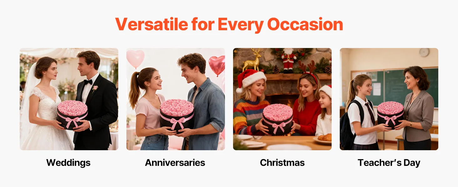 Romantyczne wieczne róże w eleganckim pudełku ze wstążką są idealnym prezentem, by wyrazić miłość partnerowi, mamie lub dziewczynie z okazji Bożego Narodzenia, urodzin lub innych specjalnych okazji.