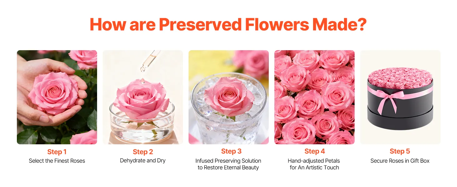 Każdy z wiecznych kwiatów wykonany jest z prawdziwych róż, przy użyciu profesjonalnych technik konserwacji, i umieszczony jest w stabilnej ramie, dzięki czemu pozostaje żywy i elegancki, zapewniając radość przez długi czas.
