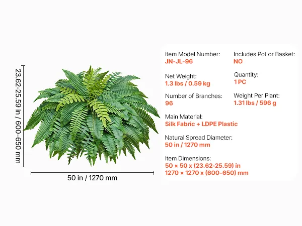 Pojedyncza sztuczna paproć: Każdy zestaw zawiera jedną z naszych sztucznych paproci. Po wysyłce można łatwo formować liście i gałązki ręcznie lub spłaszczyć je suszarką do włosów, ustawiając najniższą temperaturę. Naturalna szerokość wynosi około 1270 mm (50 cali).