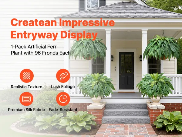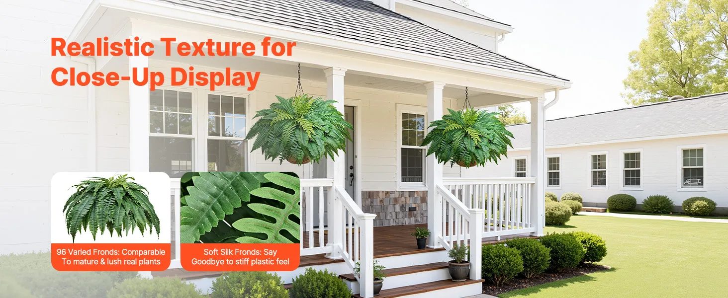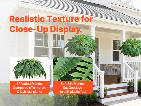 Naturalnie realistyczne: te sztuczne paprocie wykonane są z jedwabistych liści, które są miękkie w dotyku i imitują delikatną fakturę prawdziwych roślin, zachowując jednocześnie trwałość koloru. Odporne na warunki atmosferyczne gałęzie z polietylenu LDPE i wzmocnione korzenie z drutu ze stali węglowej zapewniają, że zachowują swój kształt nawet na wietrze i deszczu.
