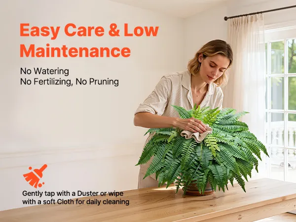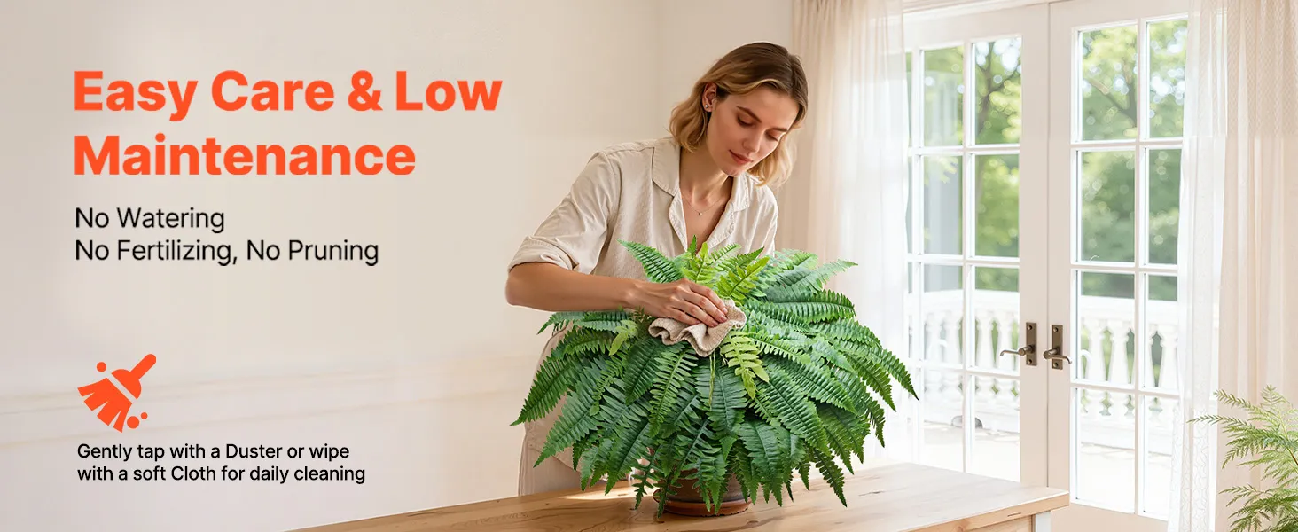 Te sztuczne paprocie są niezwykle łatwe w pielęgnacji – po sporadycznych deszczach wystarczy je wysuszyć suszarką do włosów na niskiej temperaturze, aby je odświeżyć. Nie wymagają podlewania, nawożenia ani przycinania, dzięki czemu masz więcej czasu dla rodziny, hobby lub relaksu.