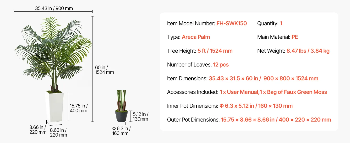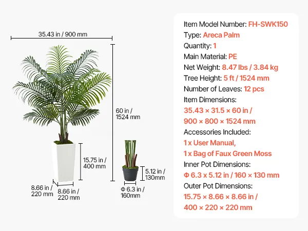 Różne rozmiary: Dostępne w wysokościach 1,20 m, 1,50 m i 1,80 m, pasujące do różnych przestrzeni i preferencji. Dzięki niezwykle realistycznemu wyglądowi, te sztuczne rośliny tropikalne stanowią efektowny akcent w salonach, biurach i przestrzeniach komercyjnych.