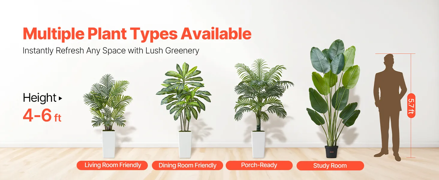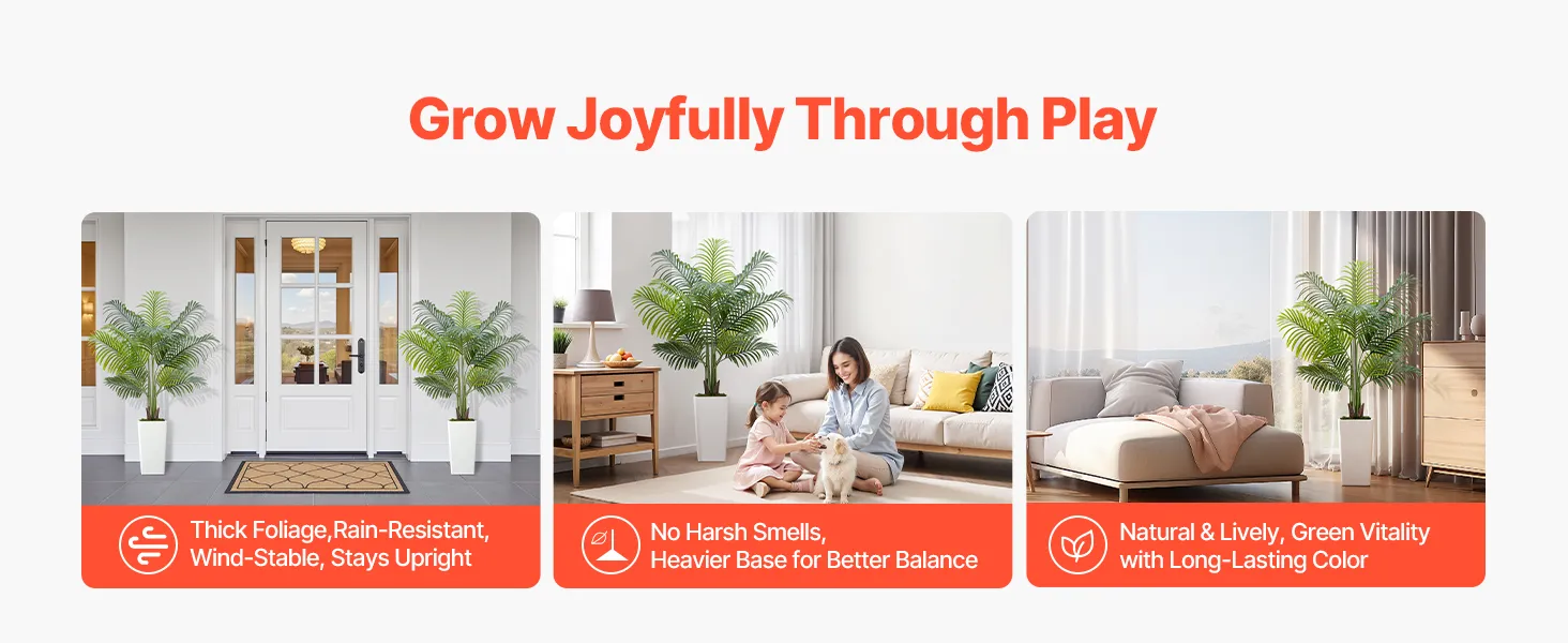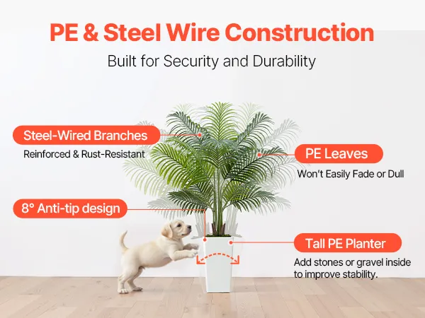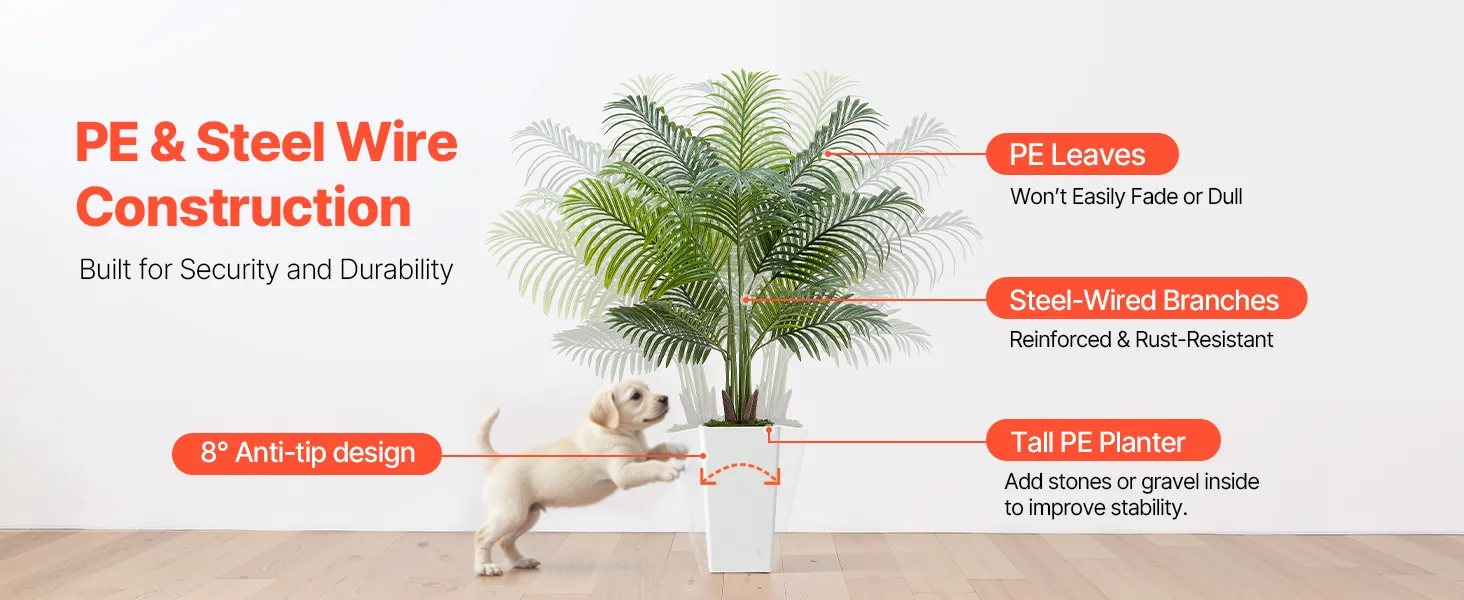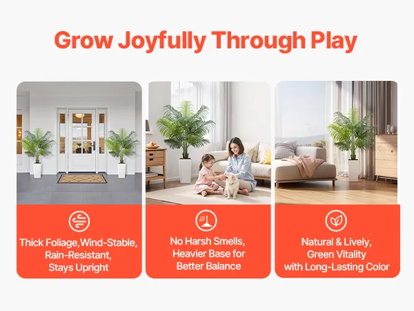 Niezawodna i stabilna konstrukcja: Wykonane z trwałego materiału PE o wodoodpornej konstrukcji, te sztuczne rośliny doniczkowe pozostają w pozycji pionowej nawet przy nachyleniu do 8°, dzięki czemu nadają się do gospodarstw domowych ze zwierzętami lub w warunkach aktywnej aktywności.