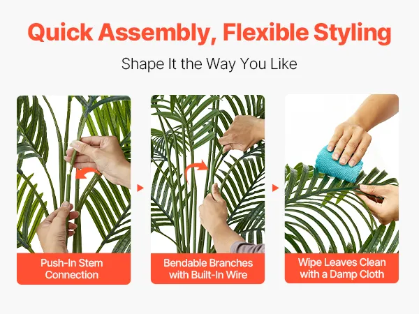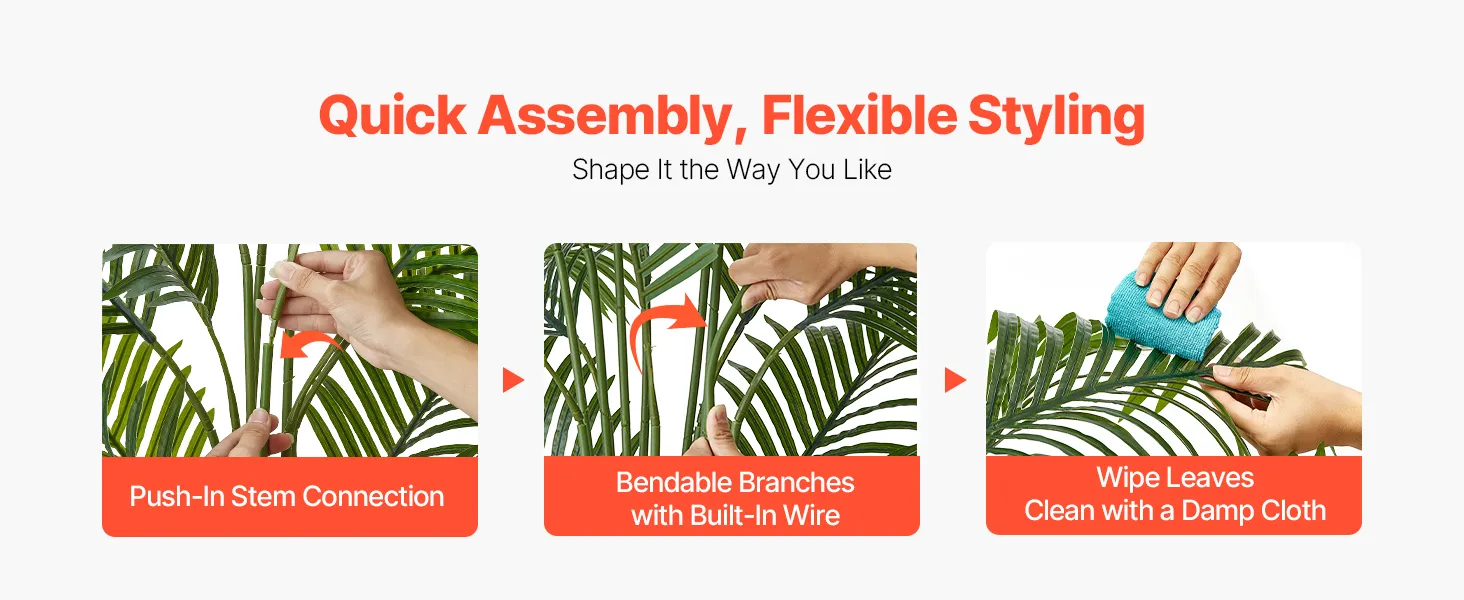 Szybki montaż i niskie koszty utrzymania: Dzięki wtykowym pniom i elastycznym gałęziom z drutu, to sztuczne drzewko tropikalne jest łatwe w montażu i formowaniu. Nie wymaga podlewania ani przycinania – wystarczy przetrzeć wilgotną ściereczką.