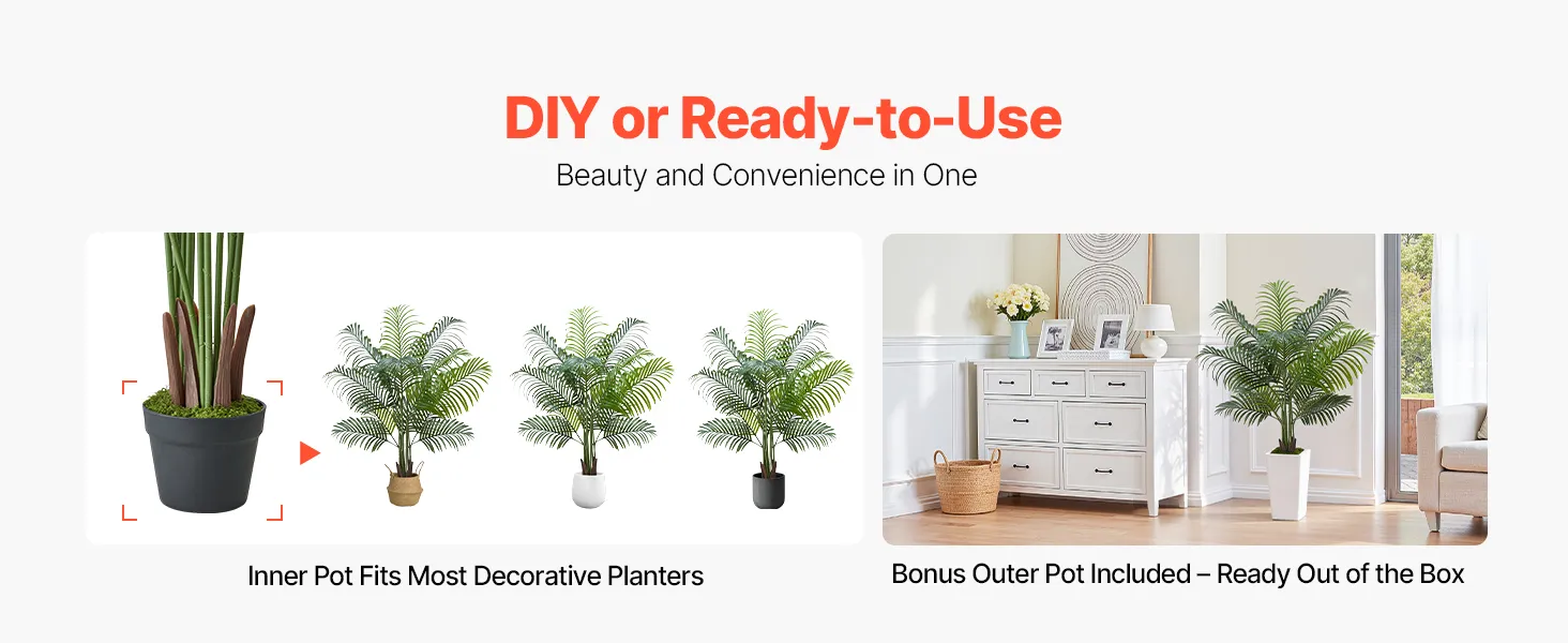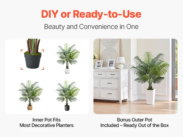 Możliwość personalizacji dekoracji: Doniczka pasuje do większości wazonów dekoracyjnych, co pozwala na łatwą wymianę pojemników, aby dopasować je do zmieniającej się aranżacji. Odśwież swoją przestrzeń bez konieczności wymiany sztucznych roślin tropikalnych.