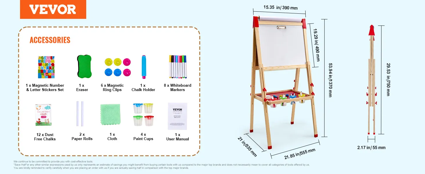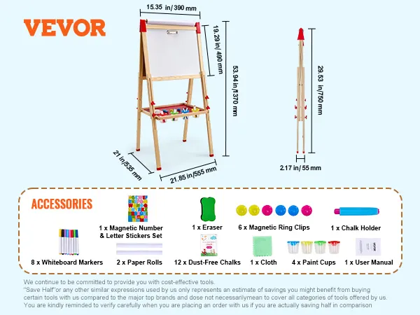 Zestaw „wszystko w jednym”: Wyposażyliśmy tę sztalugę dla dzieci we wszystko, czego potrzebują! W zestawie znajduje się 1 zestaw magnetycznych naklejek z cyframi i literami, 1 gumka, 6 magnetycznych klipsów, 1 pojemnik na kredę, 8 markerów do tablic suchościeralnych, 12 kred, 2 rolki papieru, 1 ściereczka i 4 kubeczki z farbą – wszystko gotowe, aby dzieci mogły zanurzyć się w swoim kolejnym arcydziele.