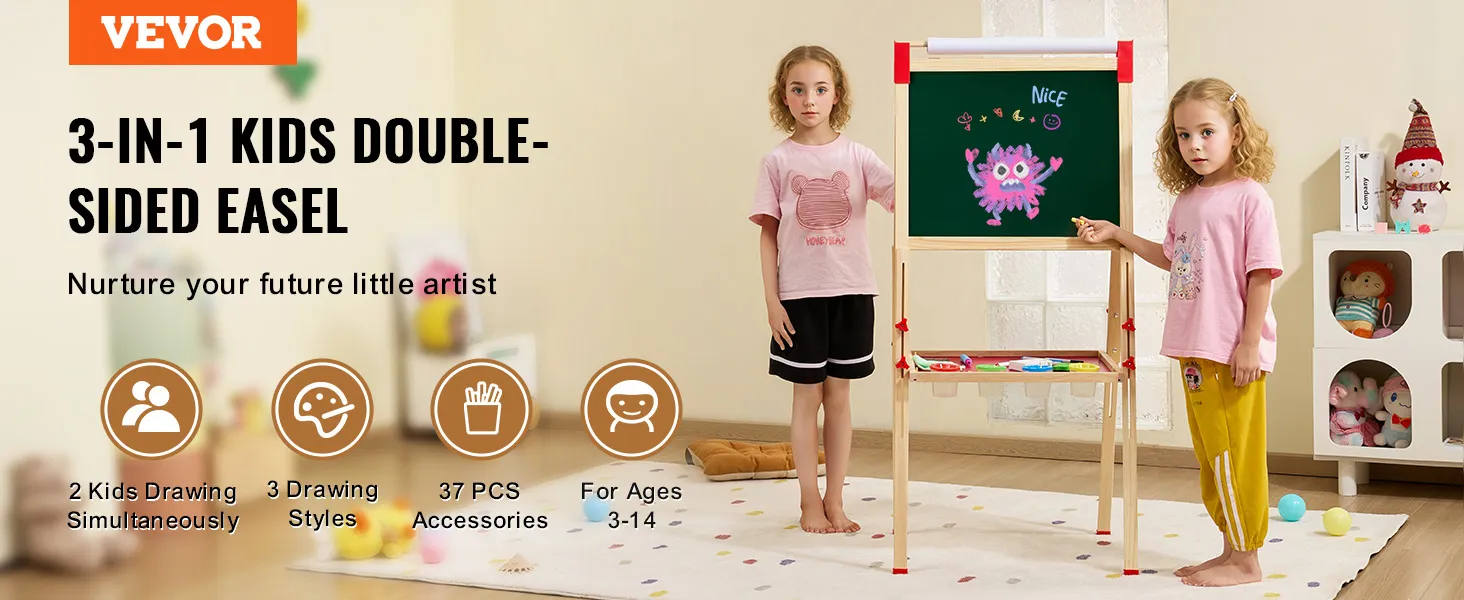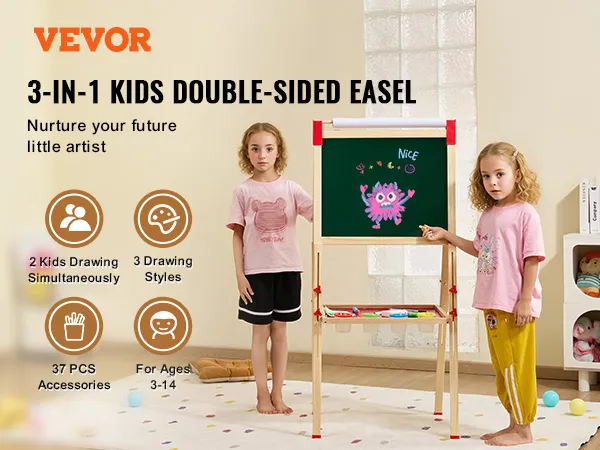 Sztaluga artystyczna VEVOR dla dzieci, drewniana sztaluga artystyczna 3 w 1 z magnetyczną tablicą suchościeralną, tablicą kredową i rolką papieru, regulowana, stojąca deska do rysowania z akcesoriami do malowania dla dzieci w wieku od 3 lat