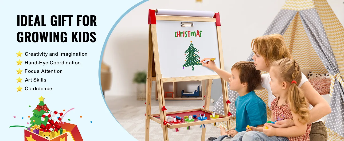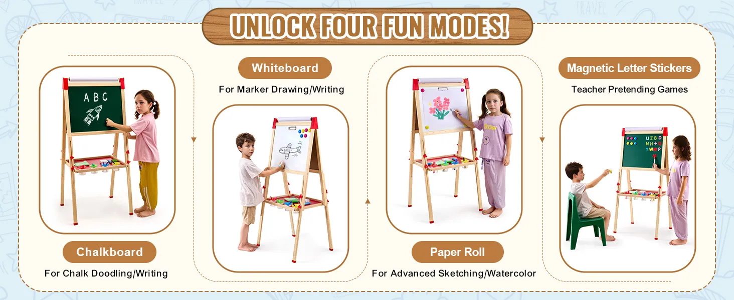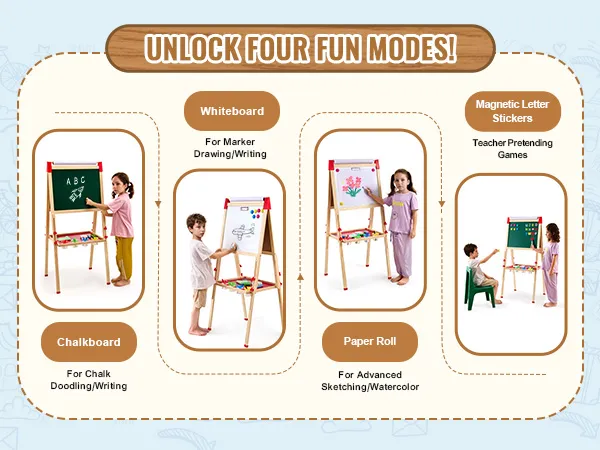 Odkryj wiele kreatywnych trybów: Ta sztaluga artystyczna dla dzieci to kwintesencja wszechstronności! Zawiera tablicę kredową, tablicę suchościeralną i rolki papieru, dając maluchom mnóstwo możliwości ekspresji. Niezależnie od tego, czy bazgrzą, piszą, czy rysują, ta sztaluga sprawi, że każda sesja twórcza będzie ekscytująca i przyjemna!