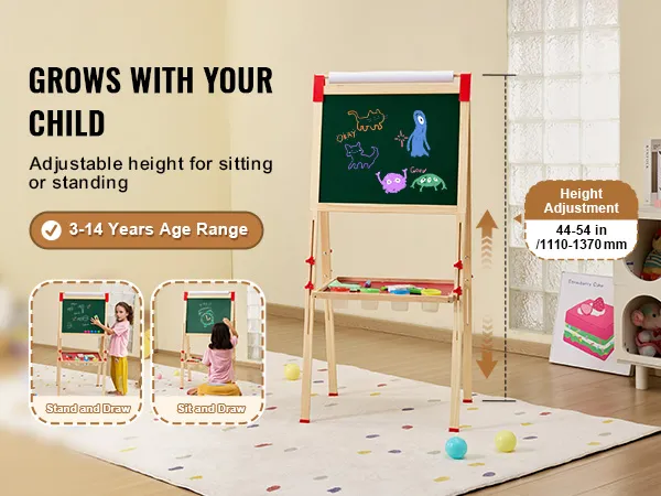 Regulowana wysokość: Dzięki regulowanej wysokości w zakresie 44-54 cali (1110-1370 mm) ta dziecięca sztaluga artystyczna rośnie wraz z dzieckiem, dzięki czemu idealnie nadaje się dla dzieci w wieku od 3 do 14 lat. Wystarczy ustawić odpowiednią wysokość, aby Twoje dziecko mogło wygodnie i przyjemnie rysować.