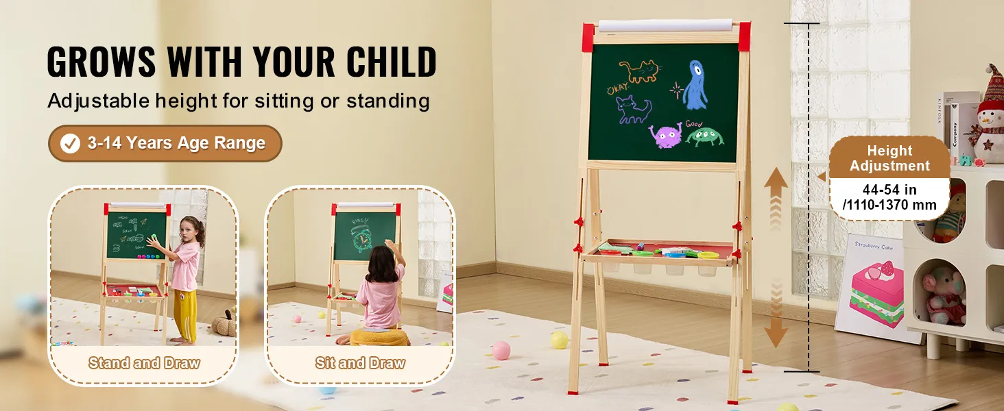 Ta sztaluga jest płynnie regulowana w zakresie od 1110 do 1370 mm (od 44 do 54 cali), co pozwala ustawić ją na idealnej wysokości dla Twojego dziecka, niezależnie od tego, czy siedzi, czy stoi. Została zaprojektowana tak, aby rosnąć wraz z dzieckiem, dzięki czemu każda sesja malowania będzie wygodna i przyjemna.