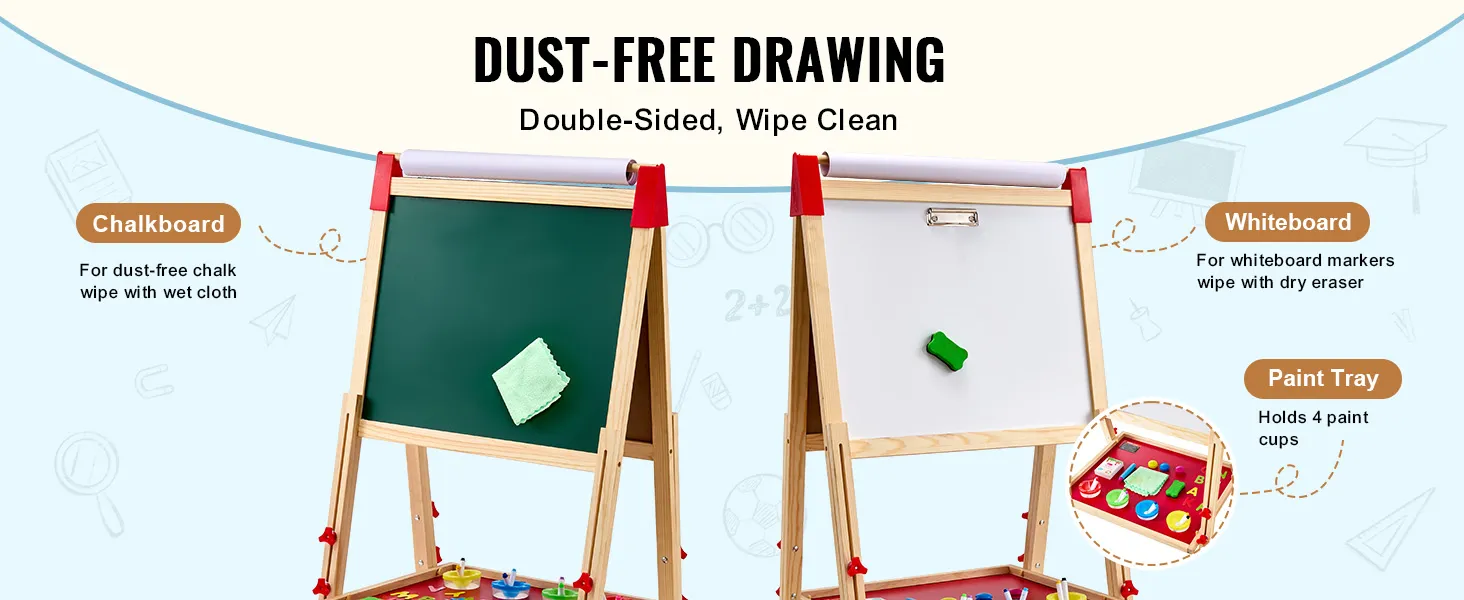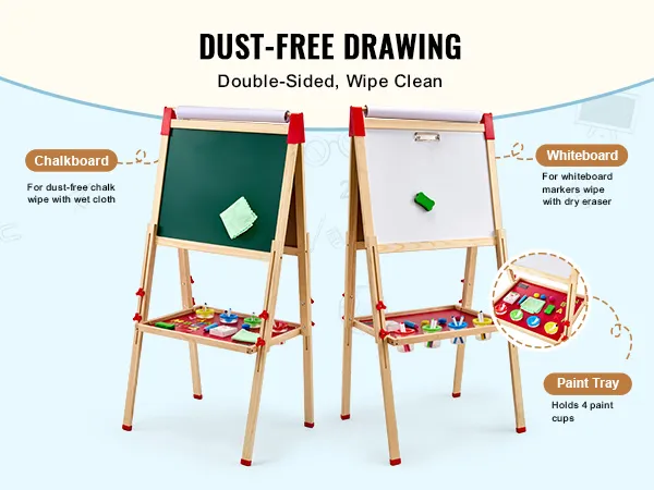 Obie strony sztalugi dziecięcej są bezpyłowe, więc nie musisz martwić się o szkodliwe cząsteczki. Po zabawie wystarczy przetrzeć ją wilgotną ściereczką i wysuszyć, a będzie jak nowa. Kuweta na farby pomoże utrzymać porządek.
