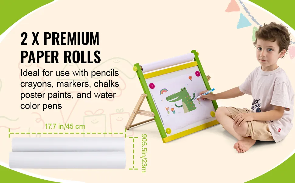 Ten zestaw artystyczny zawiera dwie rolki papieru, idealne do sztalugi Twojego dziecka. Dobrze sprawdzają się z ołówkami, kredkami, markerami, kredą, farbami plakatowymi i akwarelami – idealne do wszystkich kreatywnych potrzeb Twojego dziecka.