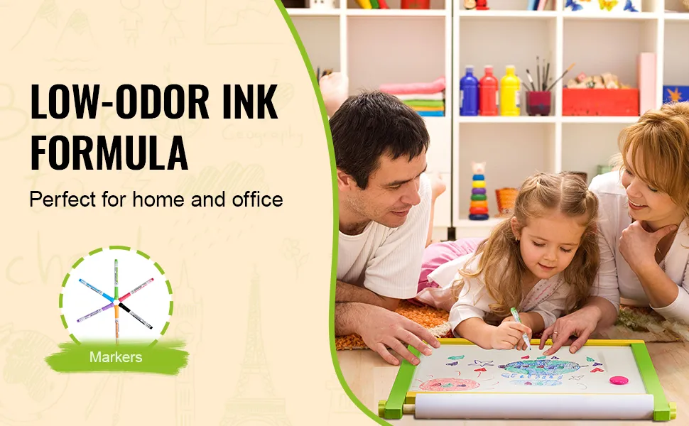 Markery bezzapachowe: Dostępne w 6 żywych kolorach, te markery bezzapachowe idealnie nadają się do domu, szkoły, a nawet biura. Łatwo się je ściera suchą ściereczką lub gumką i nie pozostawia śladów – tylko czystą powierzchnię gotową na Twoje kolejne arcydzieło.