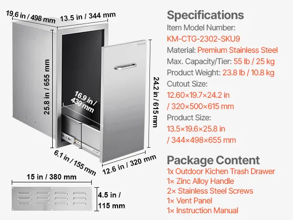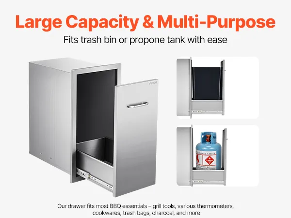 Szuflada na śmieci VEVOR do kuchni zewnętrznych z grillem, 344 x 498 x 655 mm (szer. x gł. x wys.), do przechowywania wewnątrz, wielofunkcyjne szuflady kuchenne ze stali nierdzewnej na butle z gazem propan-butan, maks. 25 kg (bez koszy na śmieci)