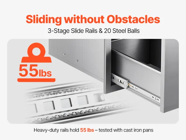 Płynne i ciche prowadnice: Ta szuflada do grilla ogrodowego jest wyposażona w 3-częściowe prowadnice kulkowe, zapewniające płynną i cichą pracę. Bardziej stabilna niż inne, każda jednowarstwowa szuflada bezpiecznie wytrzymuje obciążenie do 25 kg, zapobiegając chwianiu się.