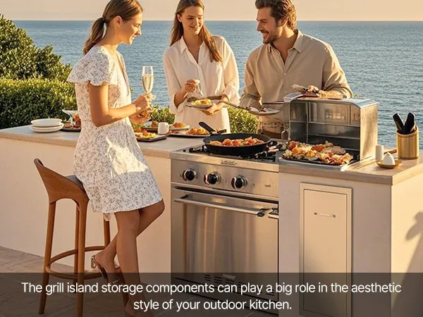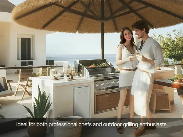 Przemyślane detale: Szuflada na grill ze stali nierdzewnej ma zaokrąglone rogi, aby zminimalizować ryzyko zarysowań, 5-calowy uchwyt ułatwiający otwieranie i bezszwową konstrukcję, która utrzymuje wnętrze w suchości i bezpieczeństwie