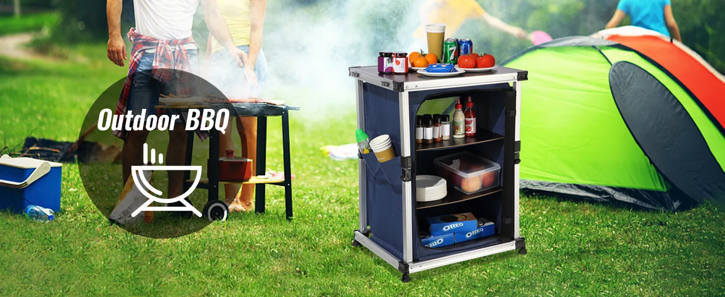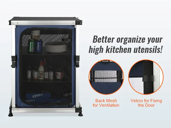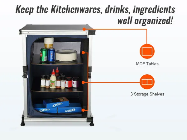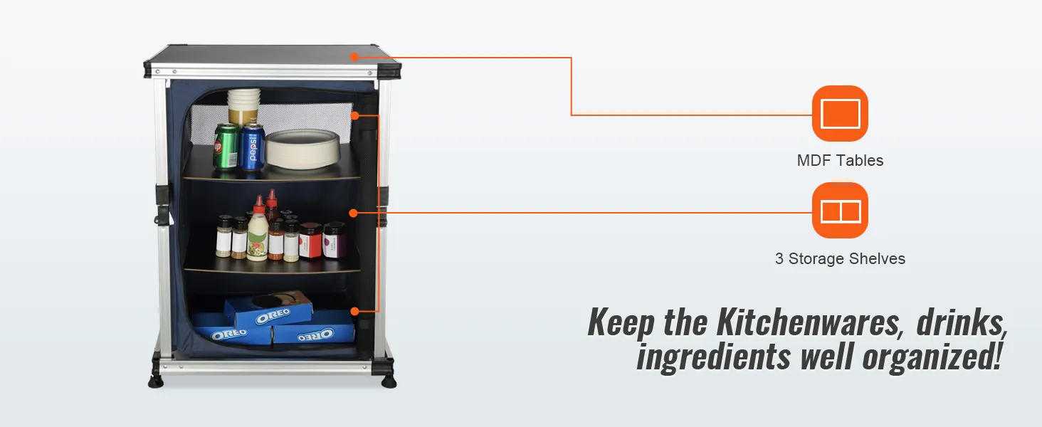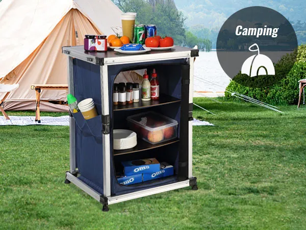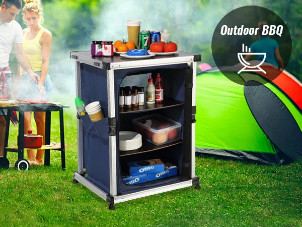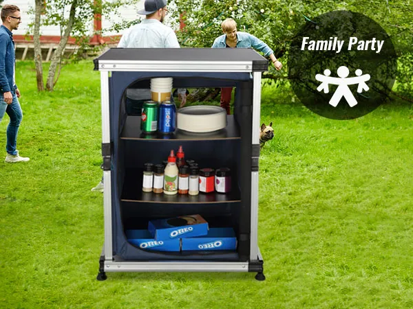 Dzięki naszemu kempingowemu stołowi kuchennemu możesz przenieść swoją kuchnię na zewnątrz! Blat stołu i schowki zapinane na zamek umożliwiają schludne przechowywanie artykułów spożywczych, kuchenek, grilli i przyborów kuchennych.
