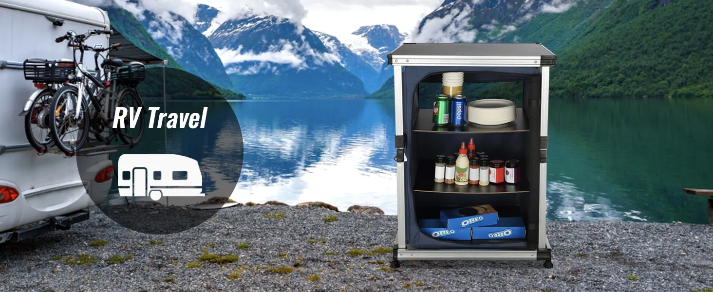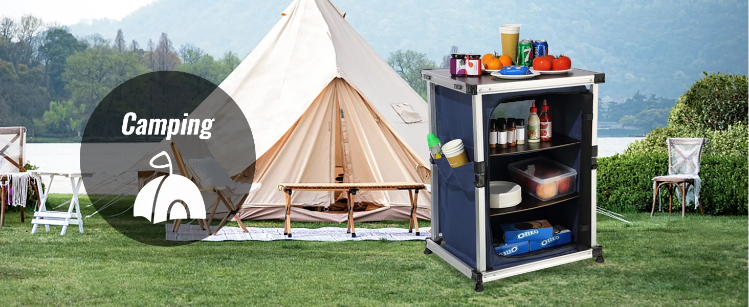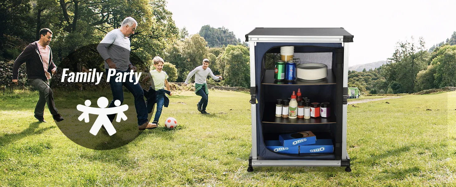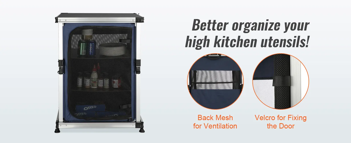 Dzięki naszemu kempingowemu stołowi kuchennemu możesz przenieść swoją kuchnię na zewnątrz! Blat stołu i schowki zapinane na zamek umożliwiają schludne przechowywanie artykułów spożywczych, kuchenek, grilli i przyborów kuchennych.