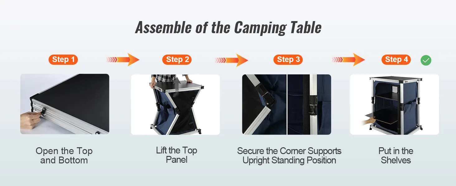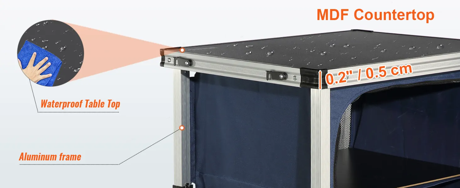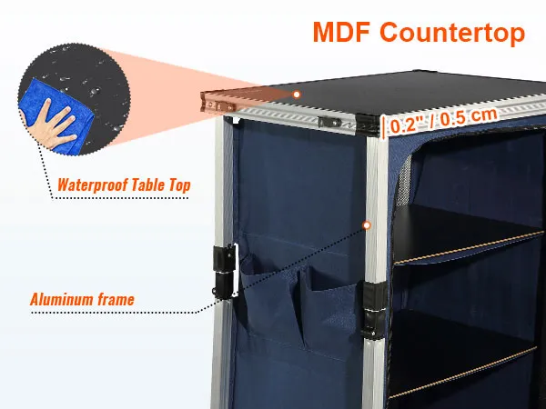Podziwiaj jego jakość: nasz kempingowy stół kuchenny został zaprojektowany z myślą o trwałości dzięki aluminiowym rurkom i wysokiej jakości blatowi z płyty MDF. Blat może udźwignąć do 30 kg (66 funtów). Sprzątanie to prosta sprawa. Posiada 4 antypoślizgowe nóżki, które zapewniają stabilność na nierównych powierzchniach.