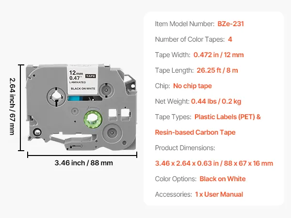 Szeroka kompatybilność: Ta czarno-biała taśma etykietowa jest kompatybilna z taśmą Brother TZe-231 i z łatwością zaspokoi wszystkie Twoje zróżnicowane potrzeby w zakresie druku. Każda rolka ma szerokość 12 mm i długość 8 m i pasuje do urządzeń Brother P-touch, takich jak PT-1230PC, PT-1280, PT-D200, PT-P400 i innych. To idealna taśma etykietowa do wszystkich potrzeb w zakresie organizacji pracy w biurze i domu.