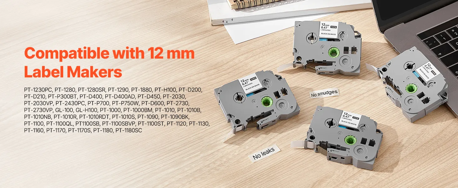 Nasza taśma etykietowa jest kompatybilna z różnymi drukarkami etykiet Brother P-Touch, takimi jak PT-1230PC, PT-1280, PT-D200 itp. Nie musisz martwić się o kompatybilność — z łatwością spełni ona wszystkie Twoje potrzeby w zakresie etykietowania.
