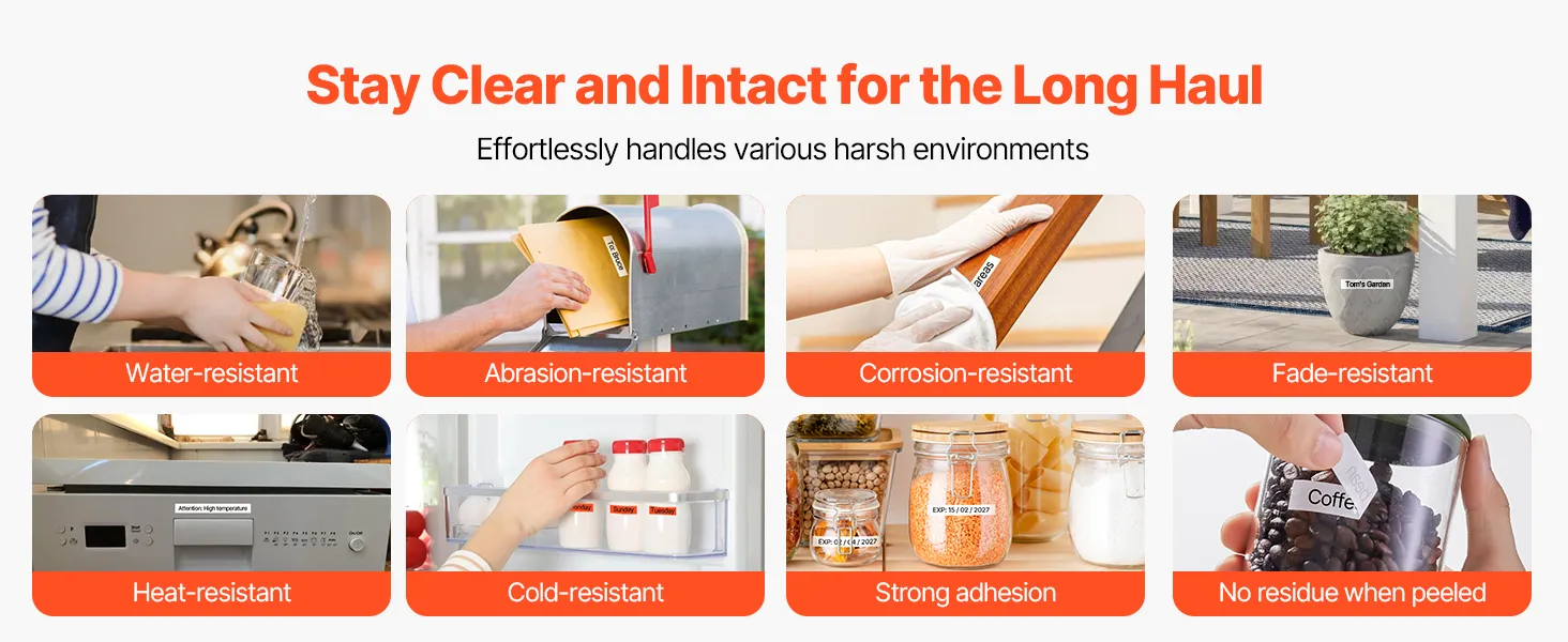 Trwała i solidna: Stworzona, by służyć przez lata! Wykonana z wysokiej jakości materiału PET i tuszu na bazie żywicy, ta taśma etykietowa jest wodoodporna, odporna na zarysowania i blaknięcie. Jest wystarczająco trwała, by służyć codziennie i gwarantuje, że Twoje etykiety zawsze będą wyglądać jak nowe.