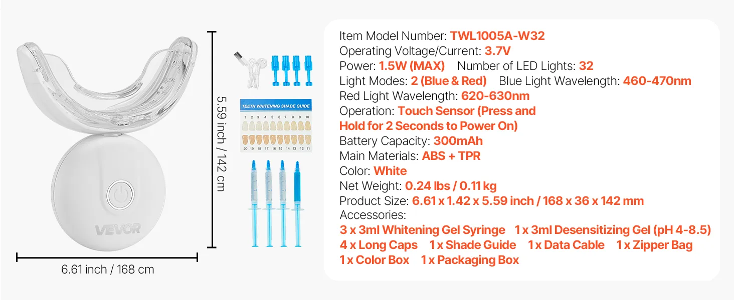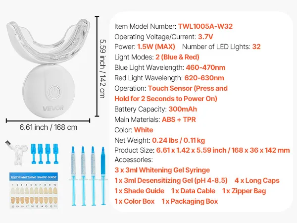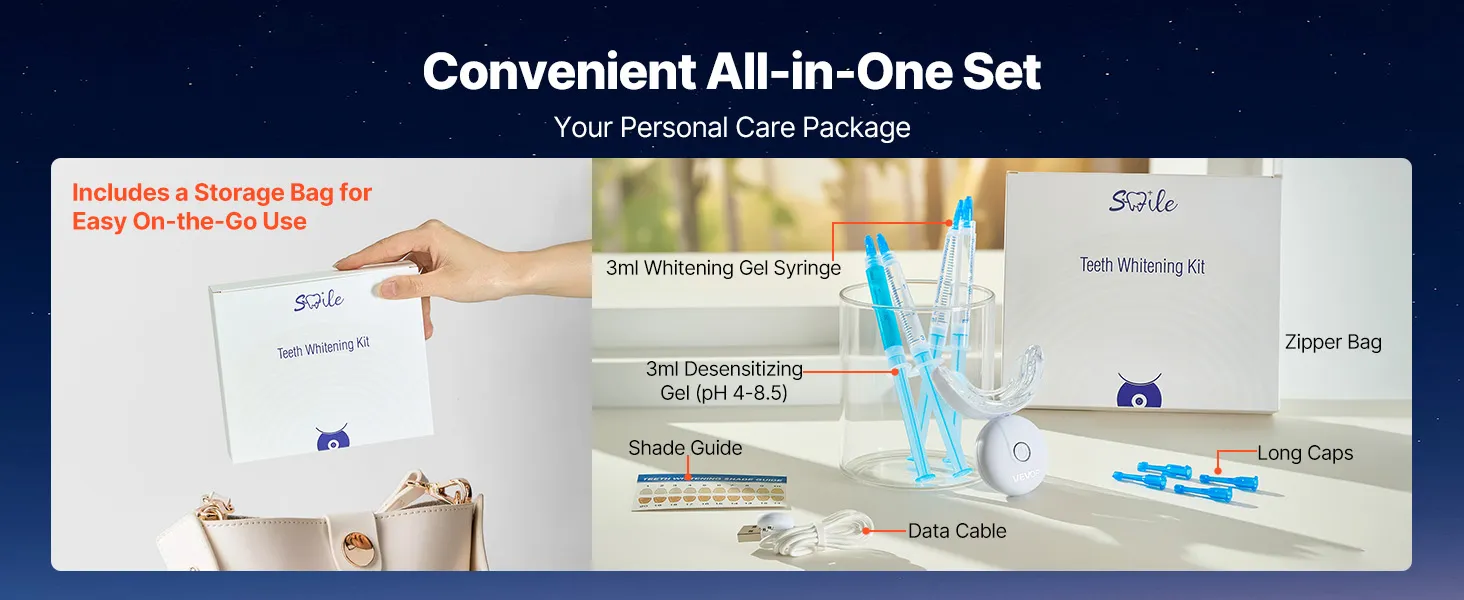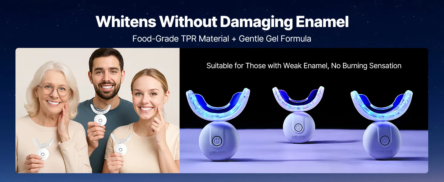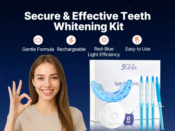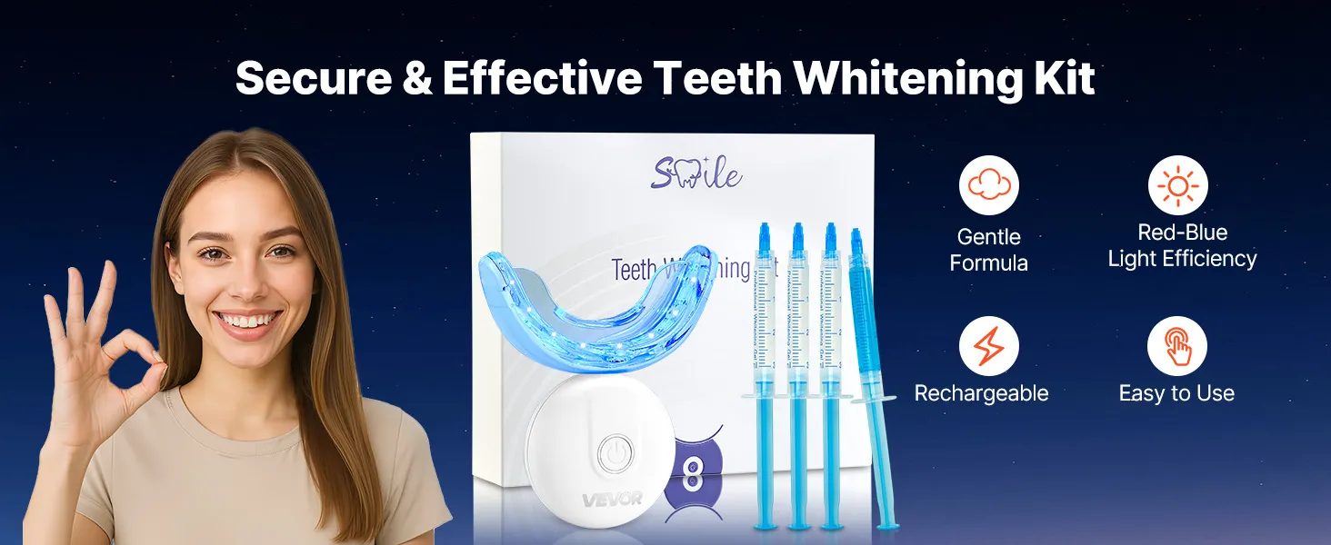 Zestaw do wybielania zębów VEVOR ze światłem LED, żelem odczulającym, nakładką w kształcie litery U i żelem wybielającym; bezprzewodowy, przenośny zestaw, który szybko i skutecznie usuwa uporczywe plamy