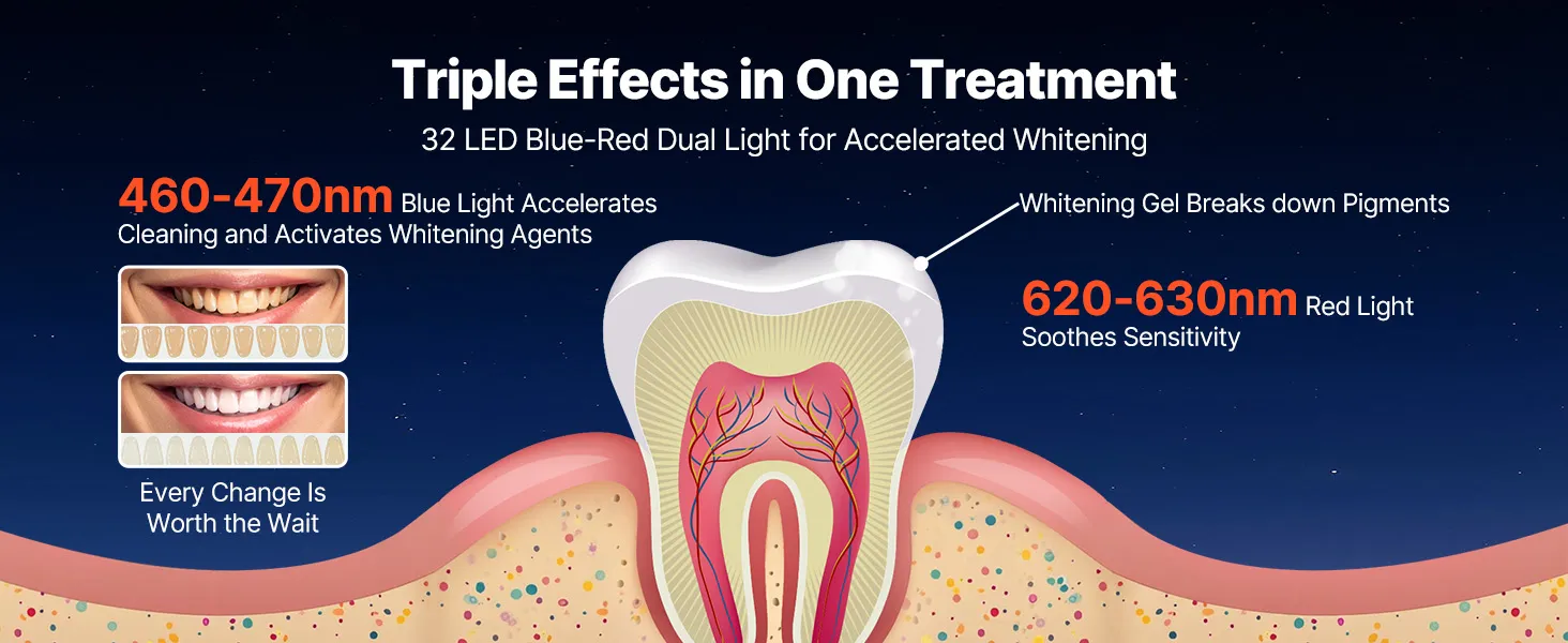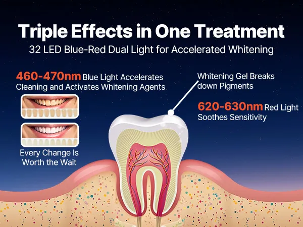 Skuteczne wybielanie zębów: Nasz zestaw do wybielania zębów LED zawiera 32 czerwone i niebieskie diody LED z dwoma trybami pracy. Niebieskie światło usuwa przebarwienia i zapewnia szybkie wybielanie, a połączenie czerwieni i błękitu zapewnia jasny i kojący efekt. Dwie długości fal wybielają zęby i łagodzą dyskomfort.